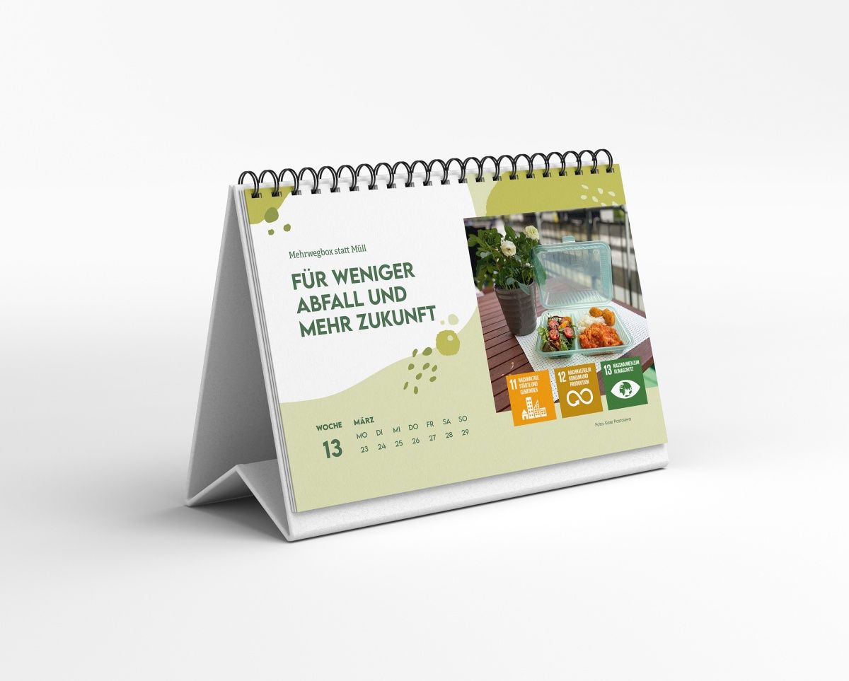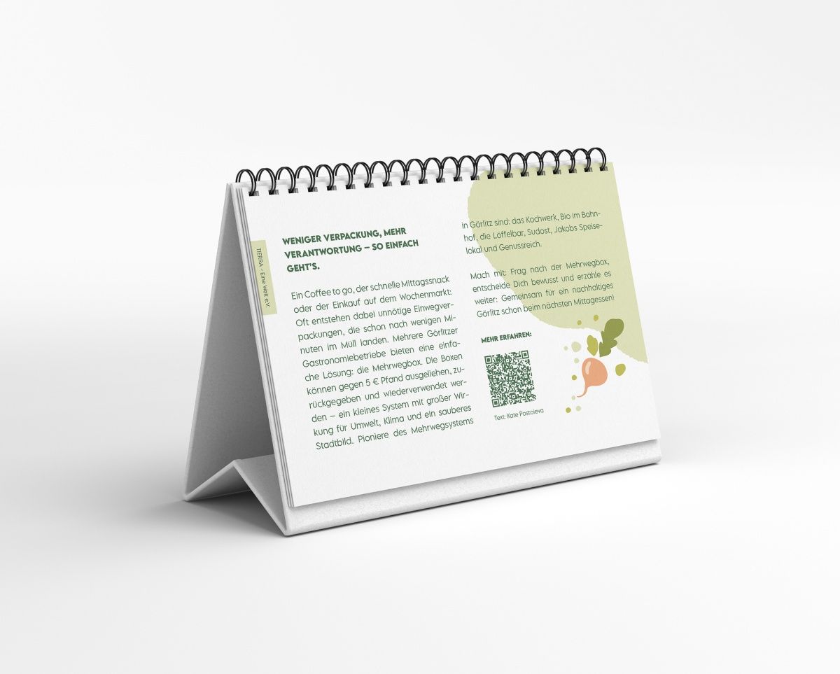 Gestaltet wurde der Kalender gemeinsam mit Aktiven aus dem Arbeitskreis Görlitz nachhaltig, Kooperationspartner*innen, Studierenden der Hochschule Zittau/Görlitz und engagierten Bürger*innen. Produziert wurde er lokal und klimafreundlich durch Juliane Wedlich (Gestaltung) und Augustadruck Görlitz (Druck).